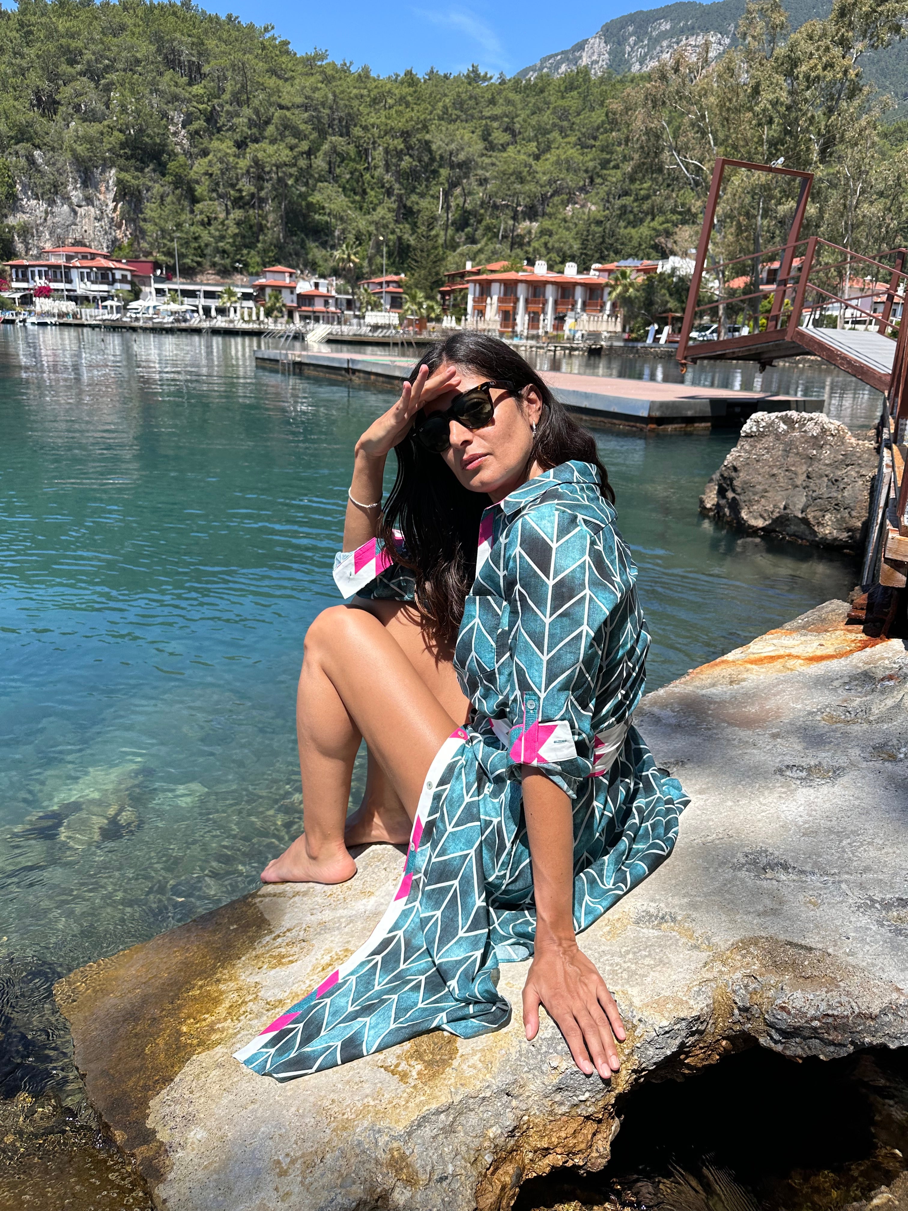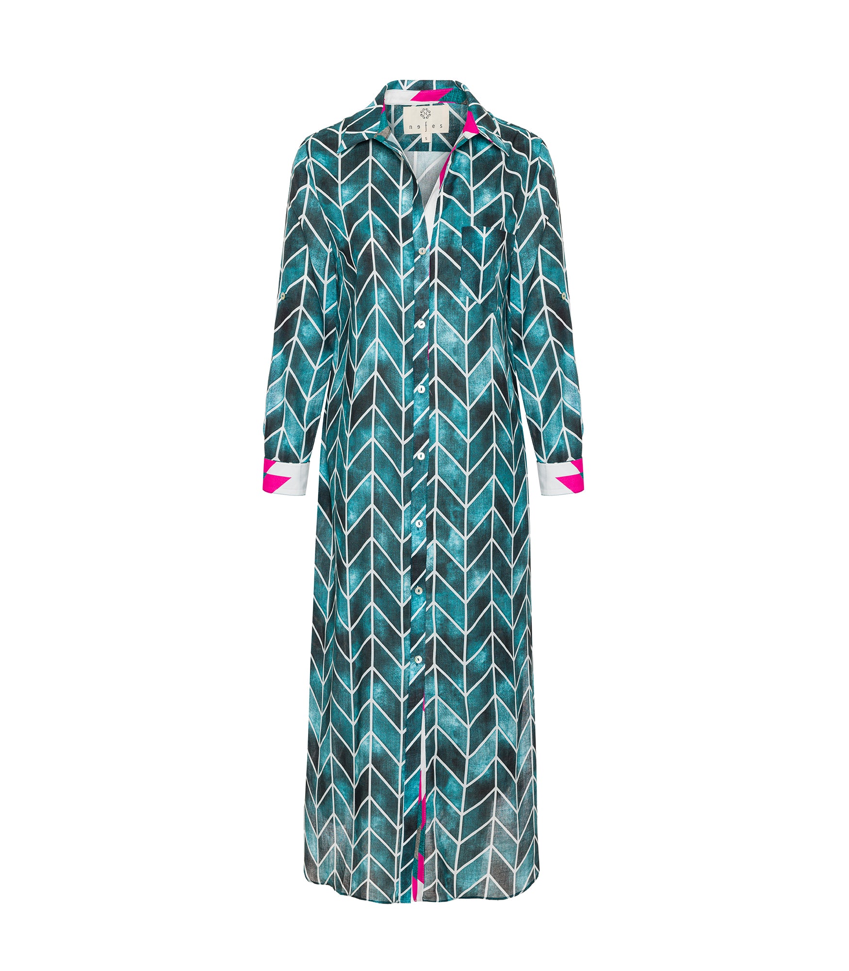 Önden düğmeli , gömlek yaka , standart kalıp , ön pat ve manşet içinde kontrast kumaş , 100% organik pamuk , Türkiye’de üretilmiştir.