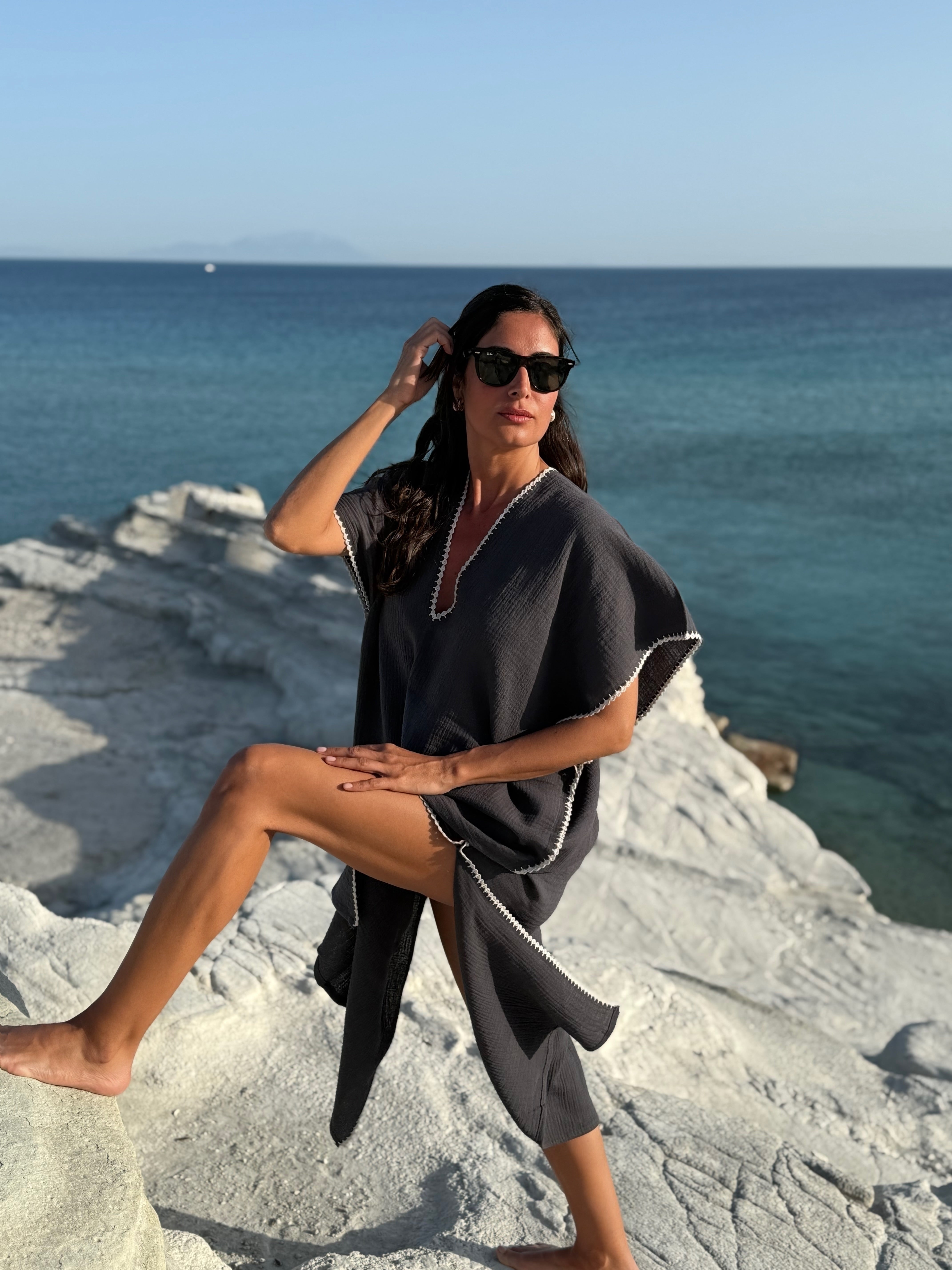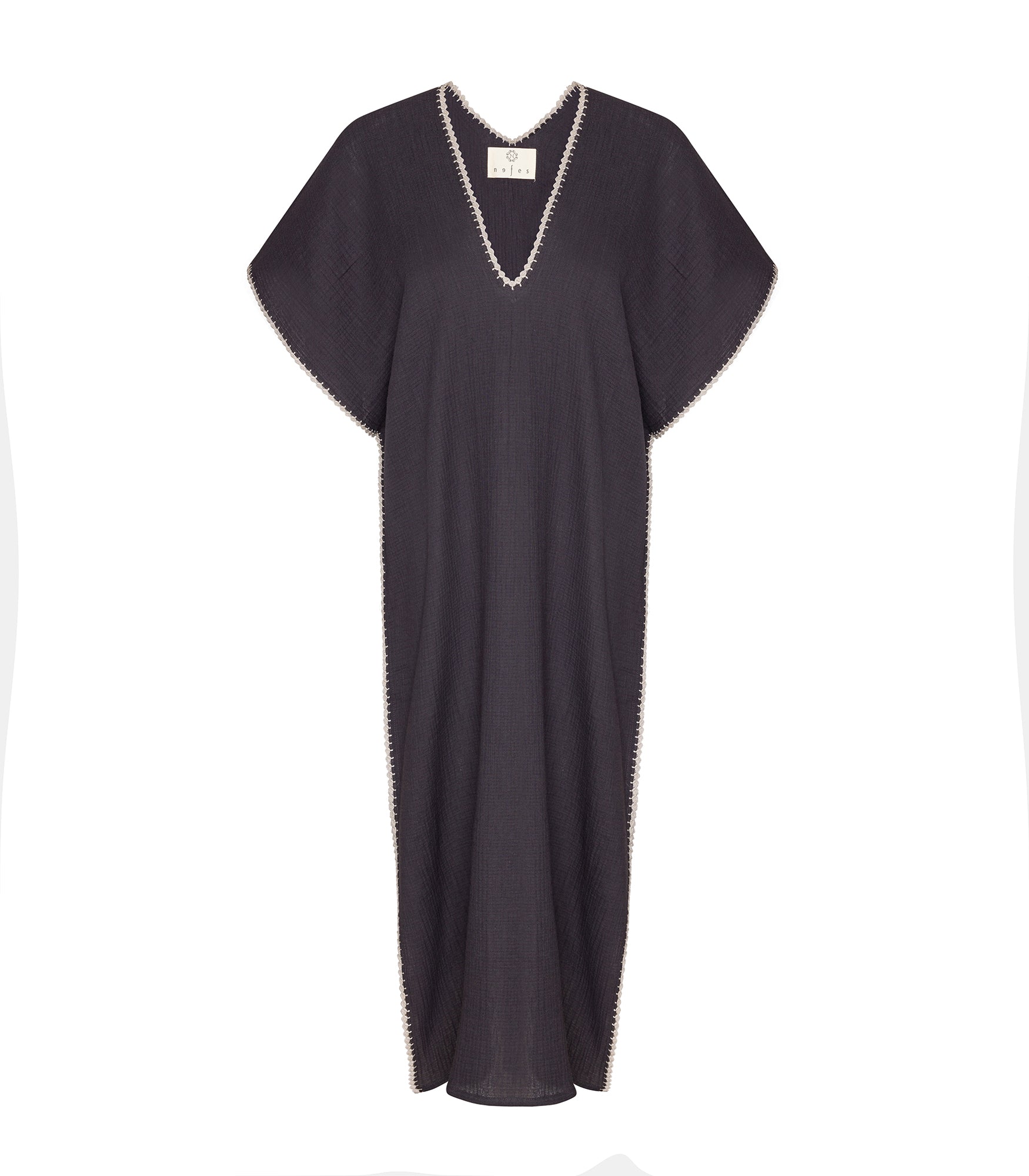 Yaka ve tüm kenarları el işi oya detaylı, V yaka dekolteli , standart kalıp , kısa kollu, uzun boy , tek beden , 100% organik pamuk , Türkiye’de üretilmiştir.